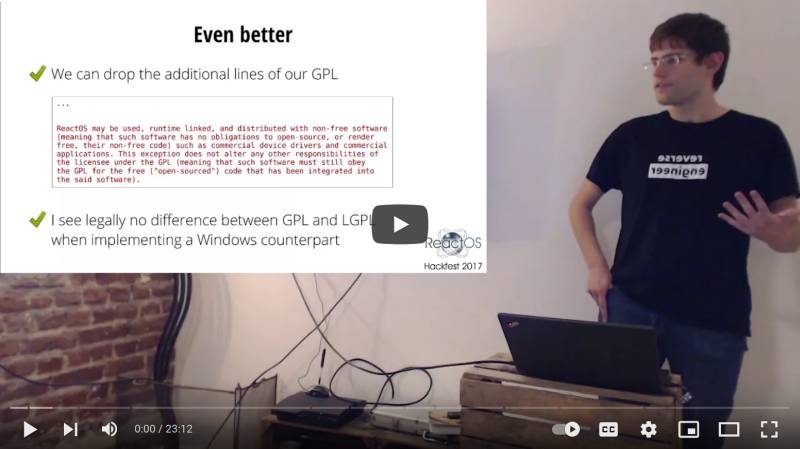The ReactOS Hackfest 2017 is still ongoing and I held my second presentation today, digging into the delicate topic of Licensing.