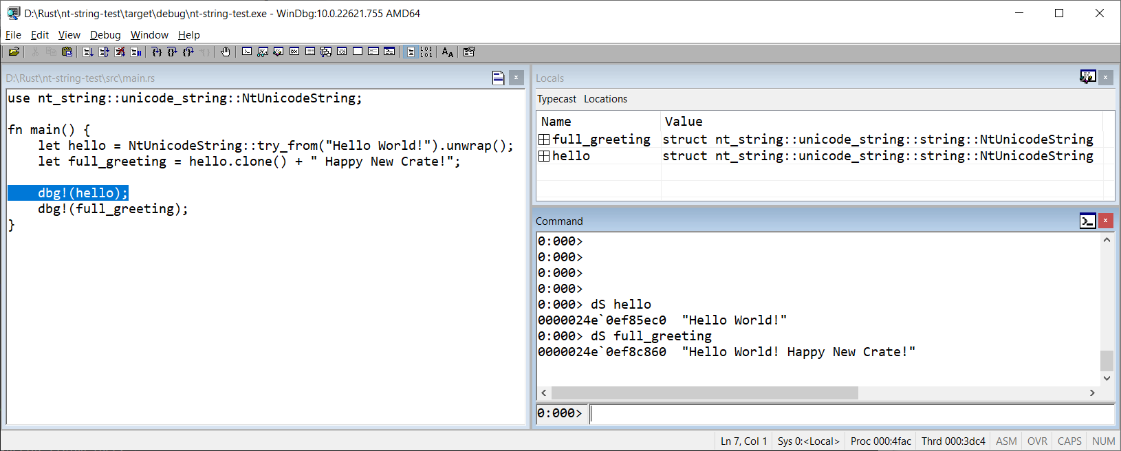 A picture says more than a thousand words, so here is the obligatory WinDbg screenshot that confirms the compatibility of my implementation with the original UNICODE_STRING: