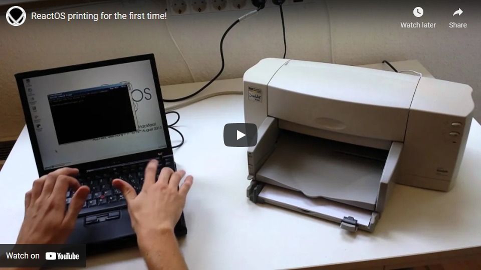 Enough said, here is a video of ReactOS printing for the first time - using my ThinkPad X61 and a HP DeskJet 710C: